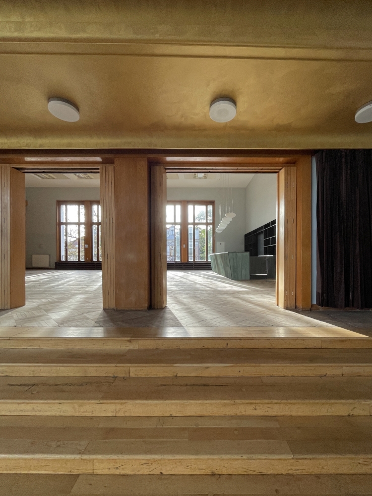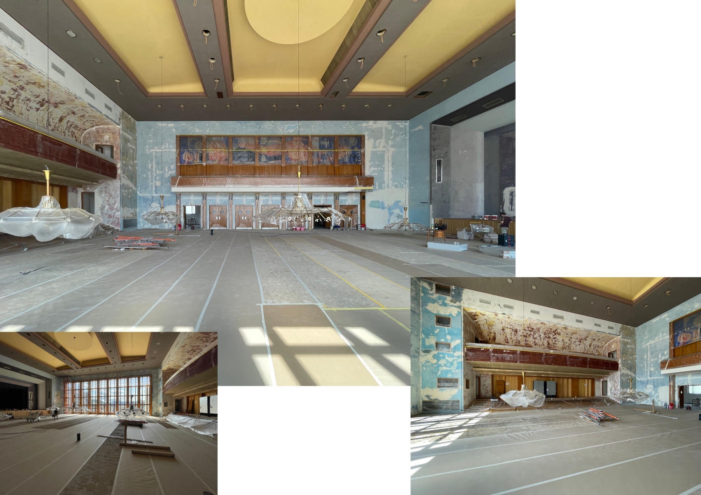 Balkon v čele hlavního sálu je vyzlacen stěrkou, která tvoří barevný komplement tmavé šedi portálu s pódiem naproti. Zlato je tu zároveň lehkou ironií - zdánlivá důležitost VIP návštěv balkonu je reprezentována blyštivou barevnou slupkou.