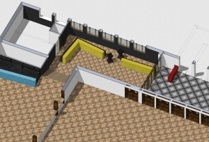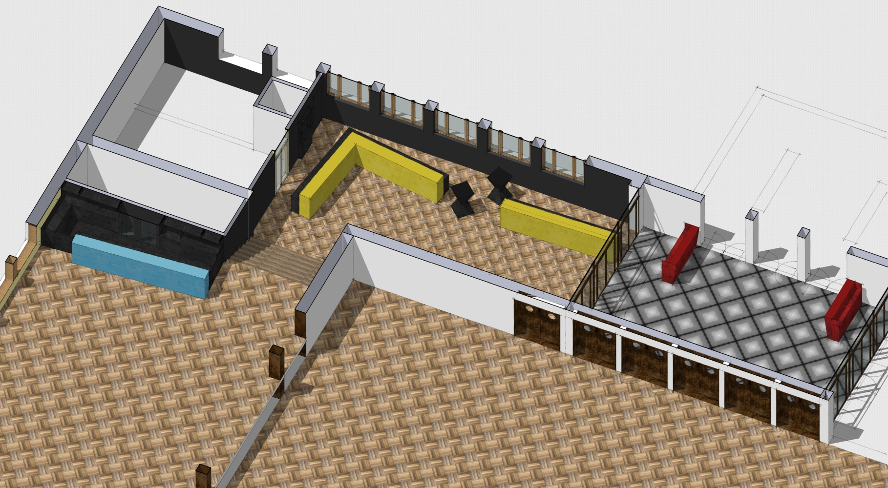 Do jednotlivých přísálí vsazujeme barevná tělesa barů osazených na černém pozadí vinoucím se za nimi plynule skrz jednotlivé prostory. Barevnost barů je hrou – půjčujeme si barevnou škálu Waltra Gropia, jako živý kontrast k abstraktně strnulé kráse klasicismu celého domu.
