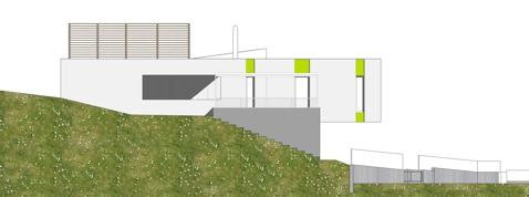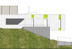 Podél těžnice ve směru východ-západ se do svahu souběžně s vrstevnicí zařezává přízemí s ordinací. Nad ním se kolem těžiště celé situace soustředí obytné patro.