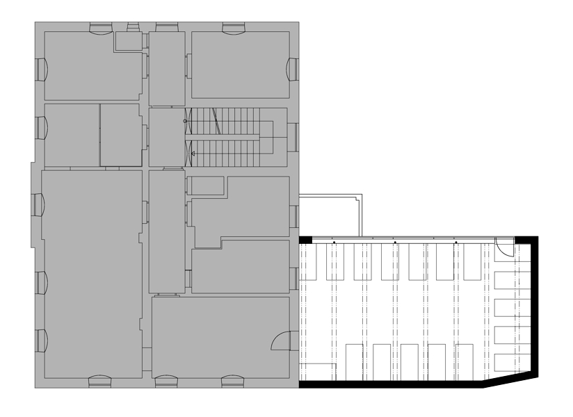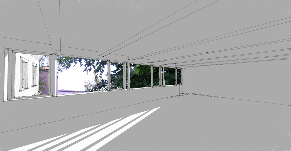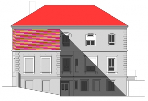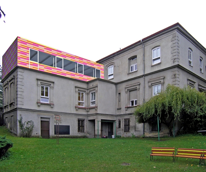 Místem pro možný růst domu se zdá velká nevyužívaná terasa nad prvním podlažím. Navrhujeme tu jeden nedělený prostor ložnice.Dřevěná konstrukce (přeneseně krov, nebo půda) je uzavřená k rušné komunikaci a otevřená širokým výhledem do dvora a zahrady. V nástavbě se protínají sudé kompoziční principy stávajícího jednopodlažního křídla a liché principy hlavního domu.