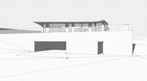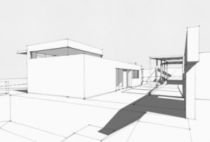 Obytný prostor domu je rozepřen mezi hranice parcely a hrot jižní stěny prodlužuje jeho fasádu. Převýšení mu proskleným pruhem pod stropem umožňuje zachytit také východní světlo.