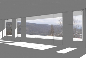 Horní zahrada - “ráj“, bude vymezena rámy o sedmi polích (pole 3x3m, pohledový beton na severní straně a subtilní ocelová konstrukce na straně západní). Rozměrem a smyslem vážou rámy na princip ohraničení „ráje“ započatý stávající zdí s bránou, jsou však opticky propustné. Jemný posun rigidní symetrie způsobuje naklonění rámů kopírující sklon terénu.