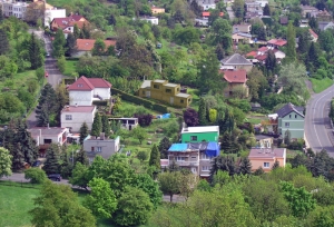 Racionální struktura skladby stavebních jednotek deformovaná tvarem a sklonem pozemku.