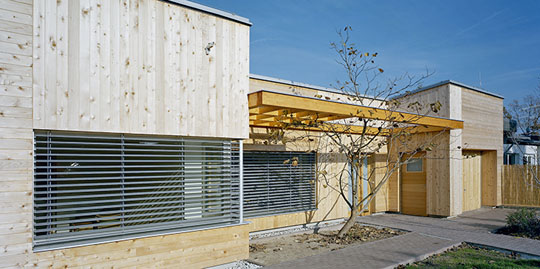 Profilovaný plech použitý jako fasádní obklad je odolný a odkazuje jednoduše k principu místně frekventované kontejnerové dopravy.