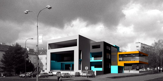 Neforemnou sedlovou střechu (produkt předchozích stavebních úprav) jsme nahradili prostorově efektivnější střechou plochou. Plášť domu jsme perforovali velkými, pevně zasklenými otvory. Nová okna sytí vnitřek domu světlem, umožňují speditérům pohodlnou kontrolu provozu kolem a nostalgicky obhlíží blízkou železnici a přilehlá periferní panorámata nemilosrdně drcená časem.