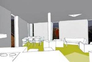 Podél těžnice ve směru východ-západ se do svahu souběžně s vrstevnicí zařezává přízemí s ordinací. Nad ním se kolem těžiště celé situace soustředí obytné patro.