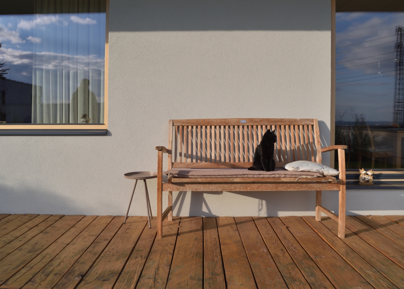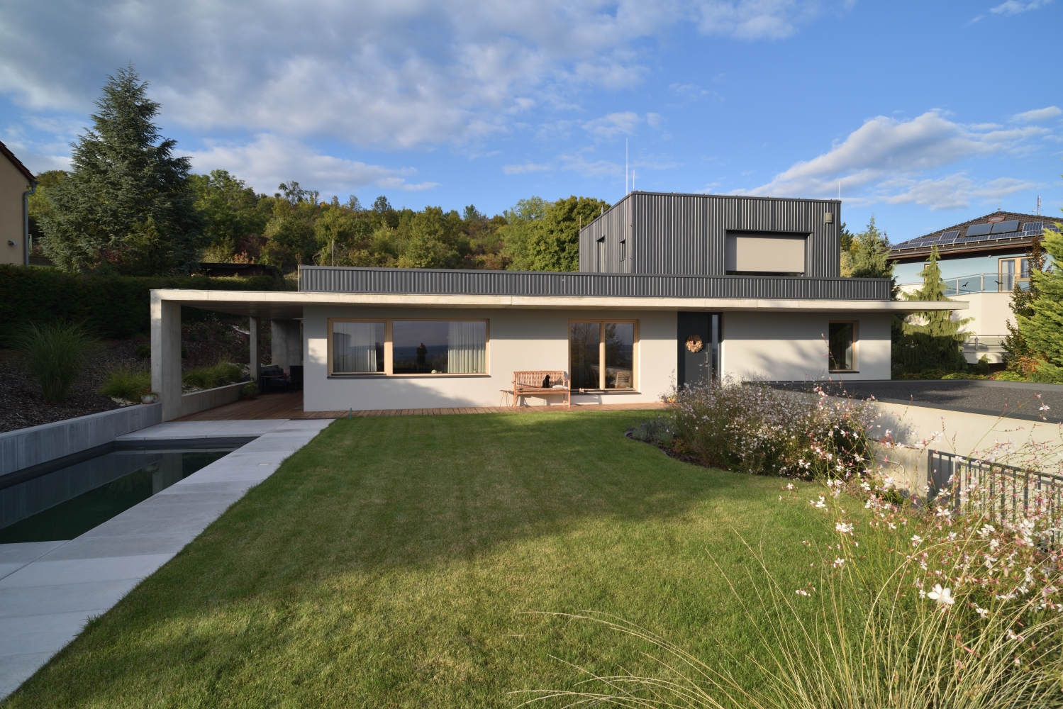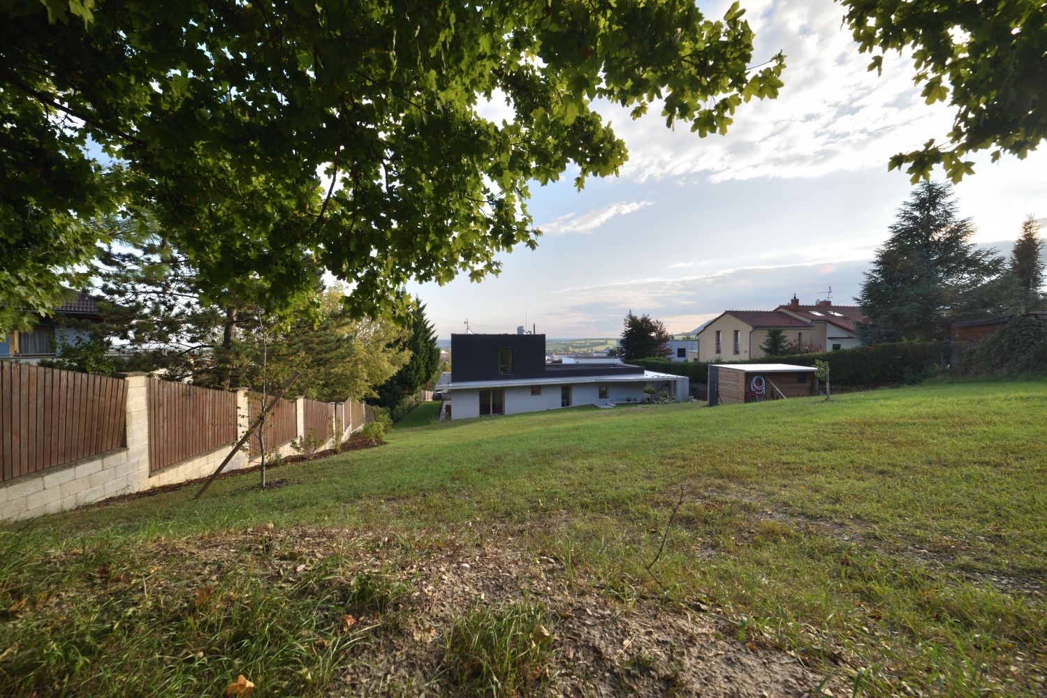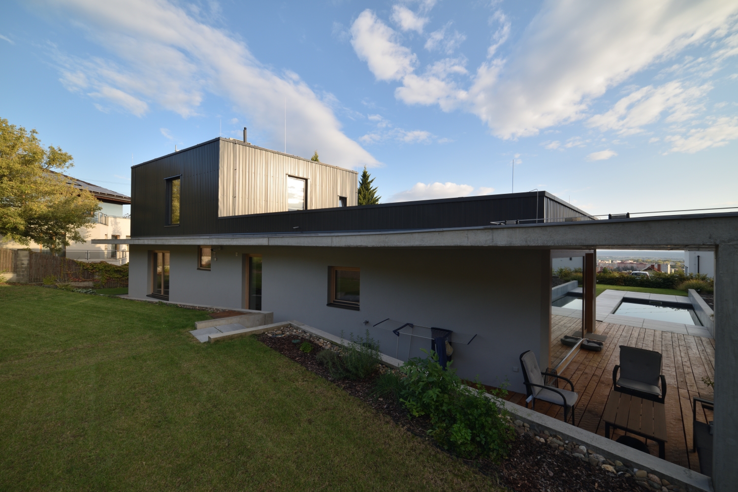Formu domu pro tříčlennou rodinu tak hledáme spíš uvnitř, než vně. Přizpůsobujeme se terénní konfiguraci a hledáme logické napojení domu na komunikaci a nejbližšího souseda.