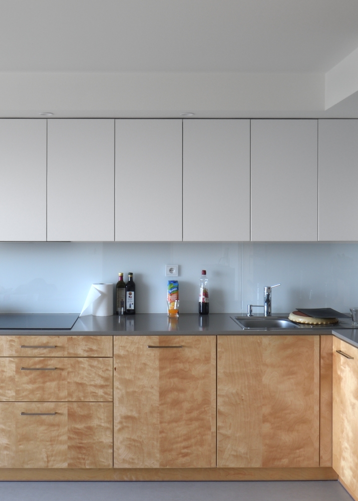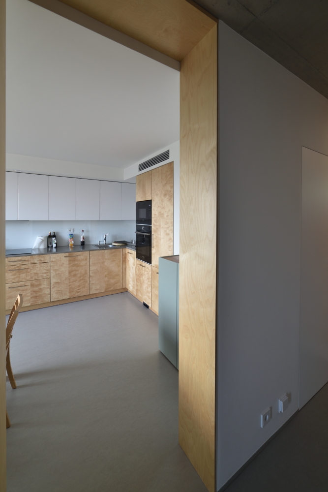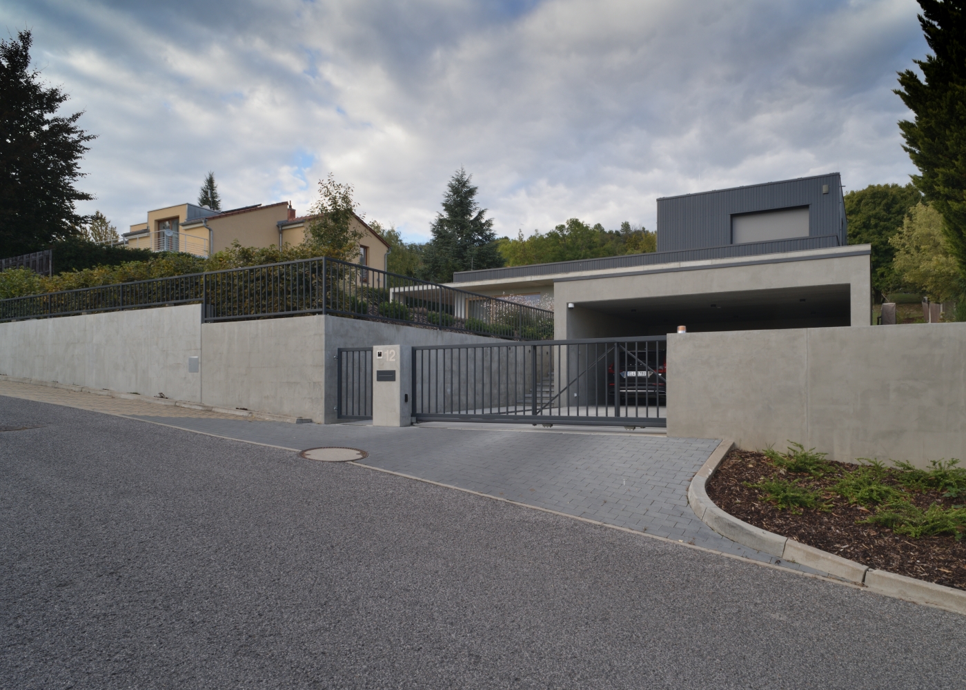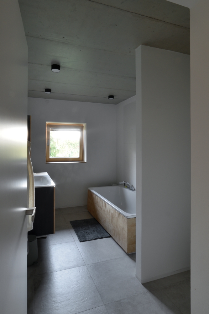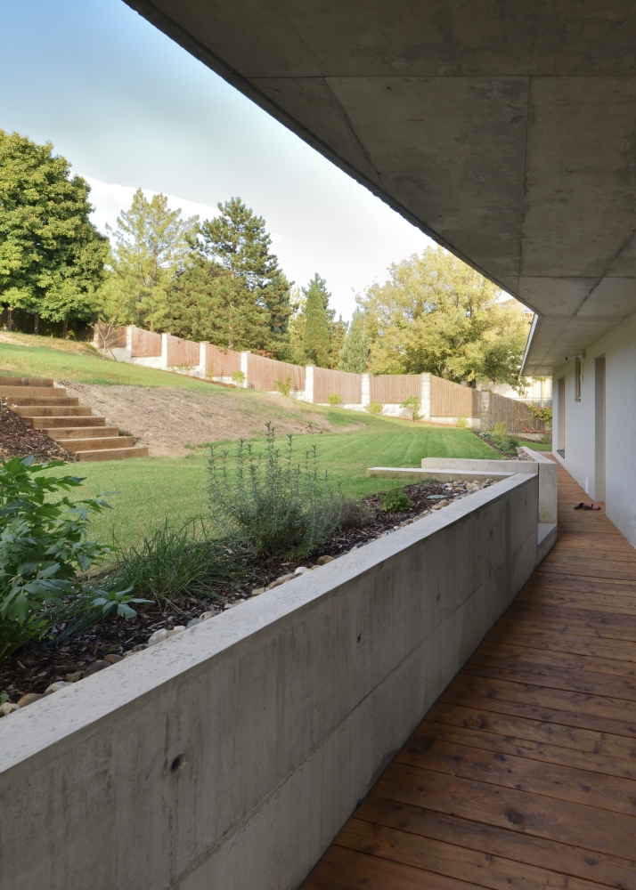 Hlavní denní děje v domě jsou soustředěny v přízemí. V patře je ložnice se střešní terasou. Výrazná betonová konzola lemující dům je přístřeškem nad domovními vstupy, sluneční clonou a zastřešením terasy navazující na obytný prostor.