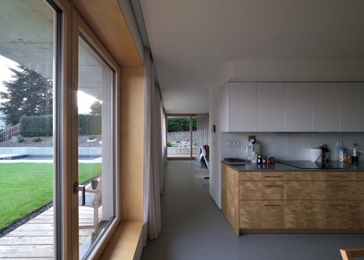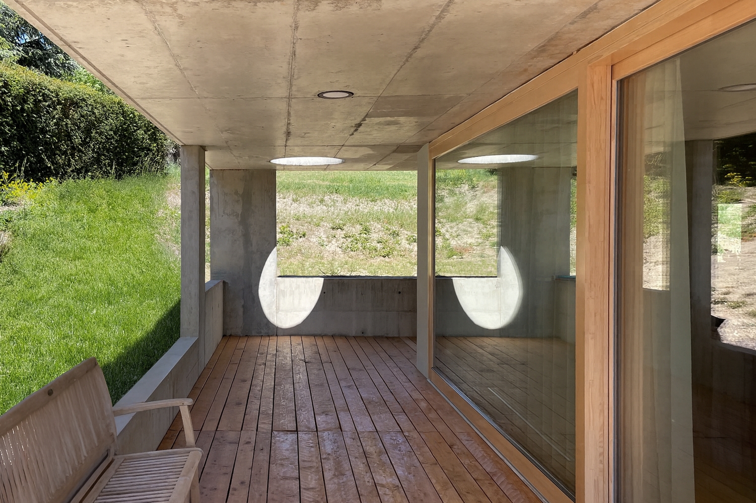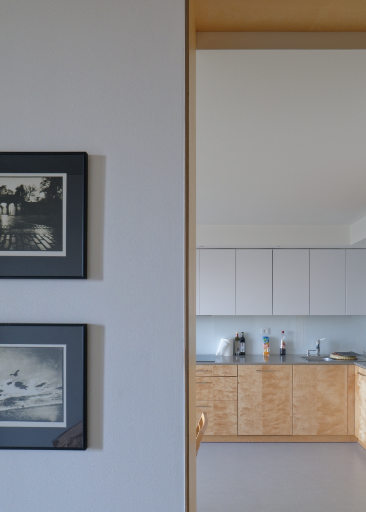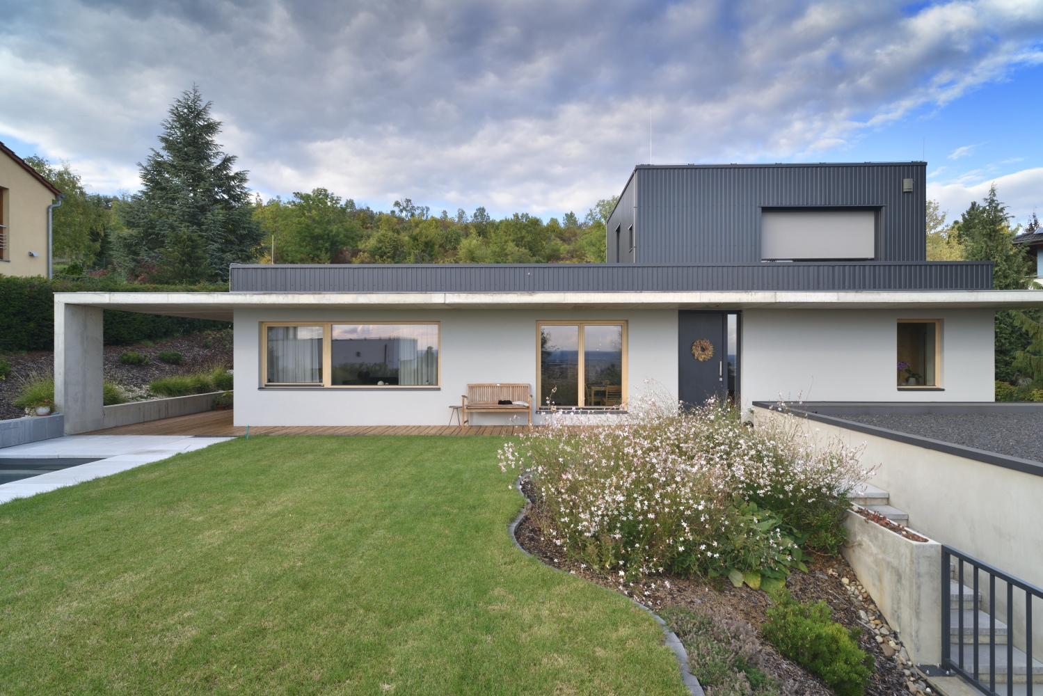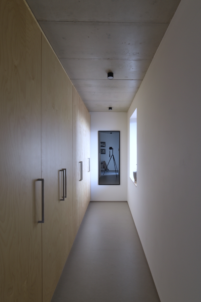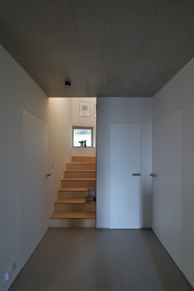 Hlavní denní děje v domě jsou soustředěny v přízemí. V patře je ložnice se střešní terasou. Výrazná betonová konzola lemující dům je přístřeškem nad domovními vstupy, sluneční clonou a zastřešením terasy navazující na obytný prostor.