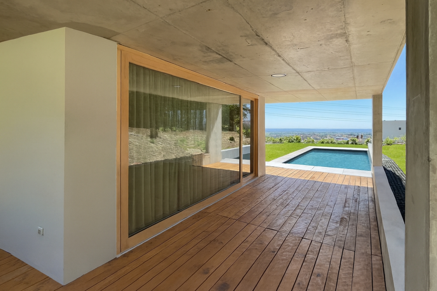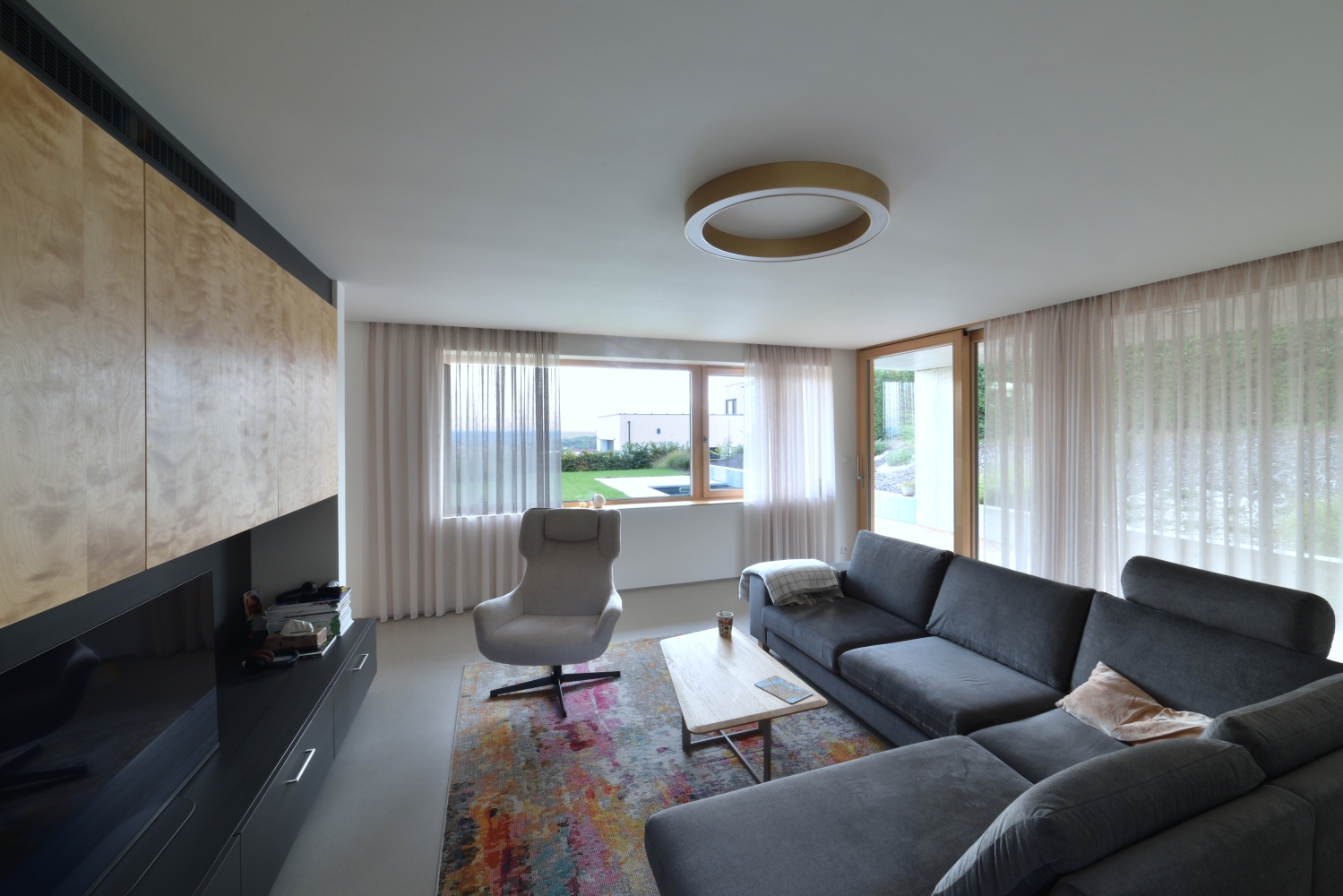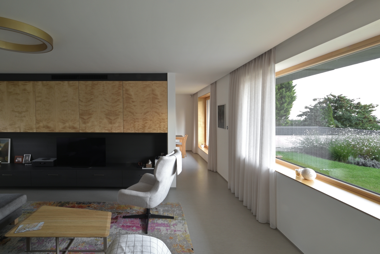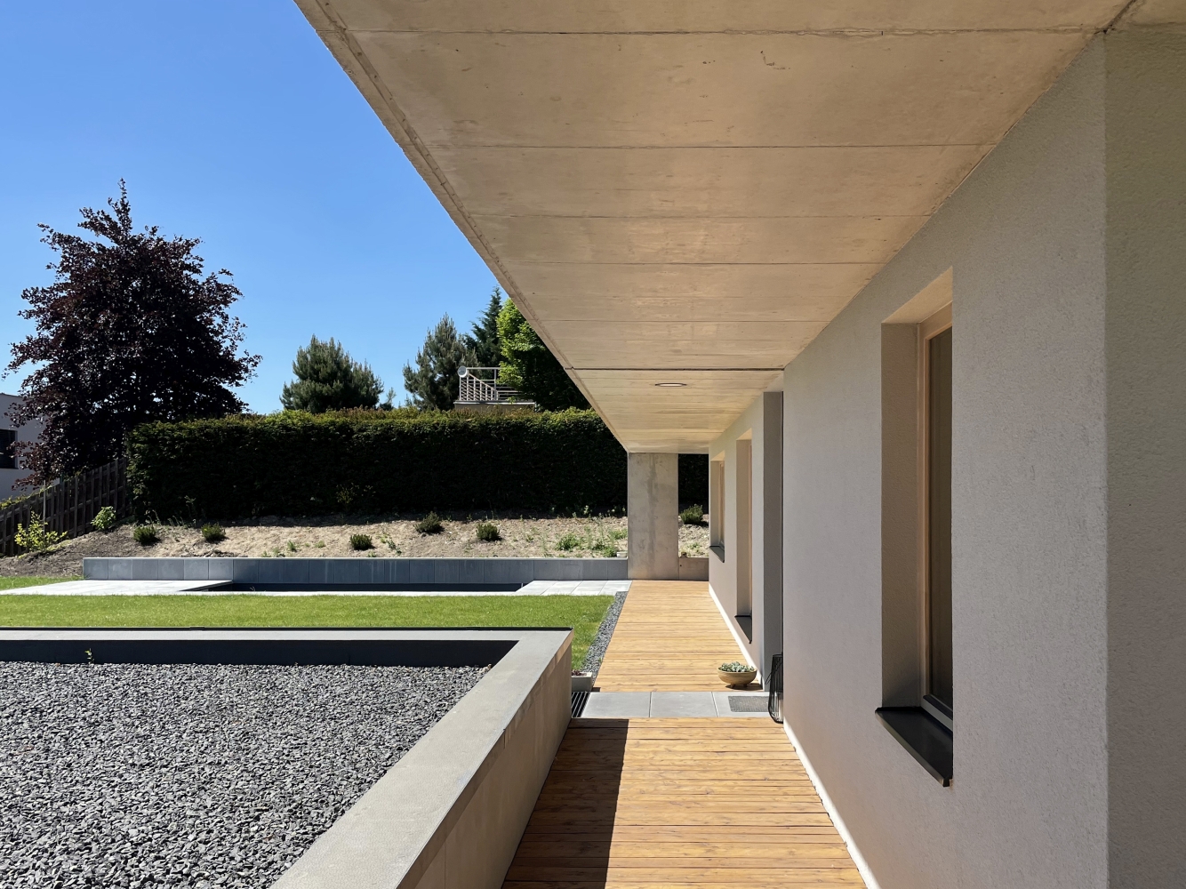 Hlavní denní děje v domě jsou soustředěny v přízemí. V patře je ložnice se střešní terasou. Výrazná betonová konzola lemující dům je přístřeškem nad domovními vstupy, sluneční clonou a zastřešením terasy navazující na obytný prostor.