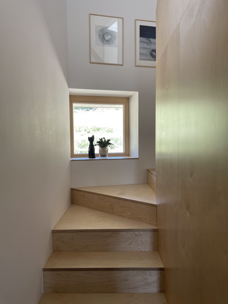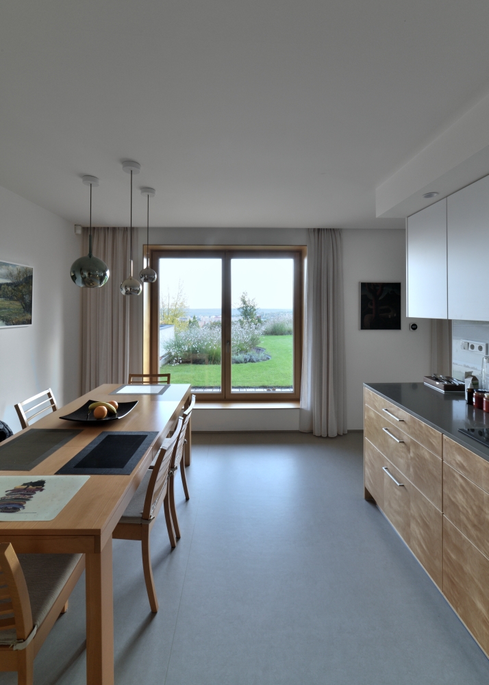 Formu domu pro tříčlennou rodinu tak hledáme spíš uvnitř, než vně. Přizpůsobujeme se terénní konfiguraci a hledáme logické napojení domu na komunikaci a nejbližšího souseda.